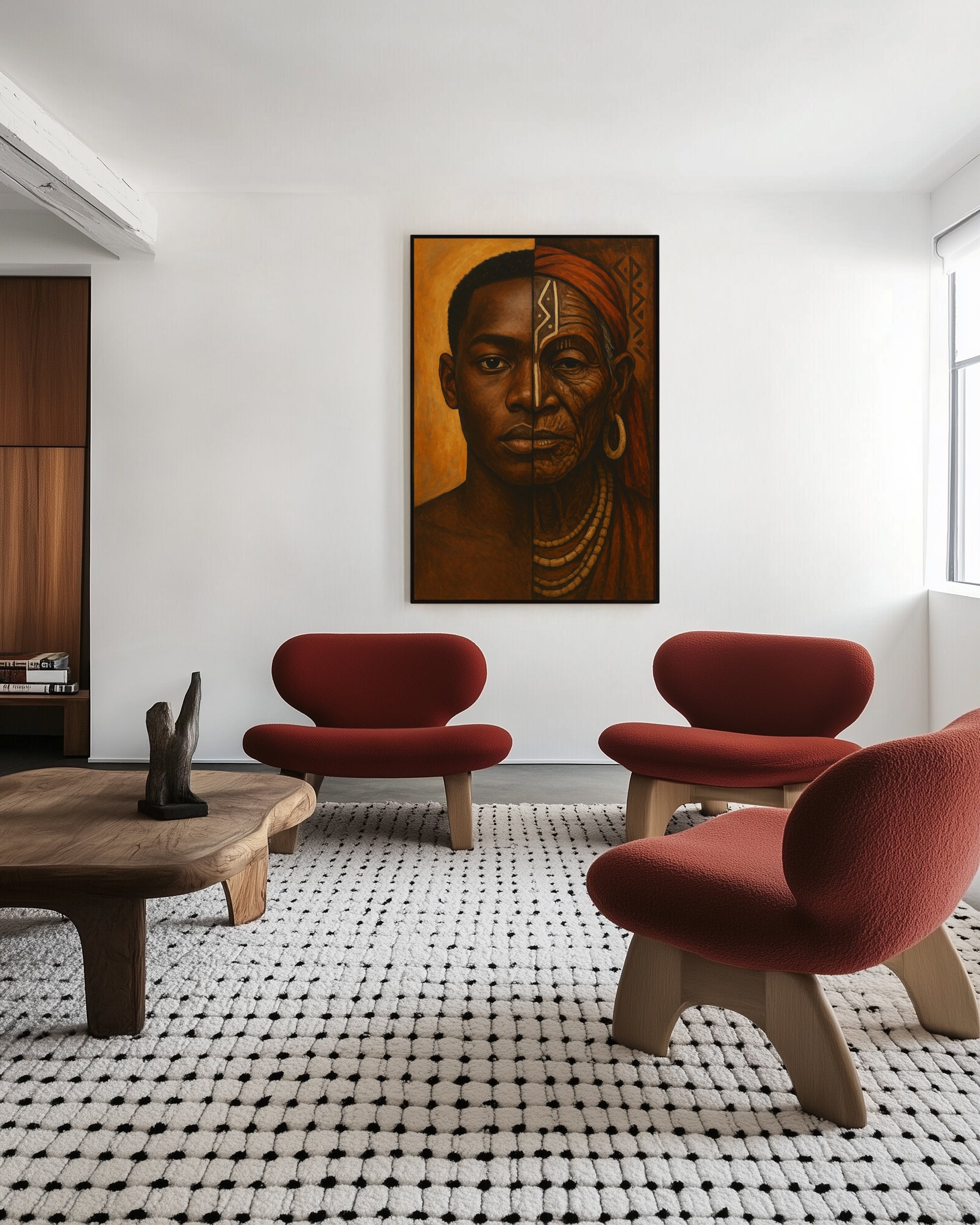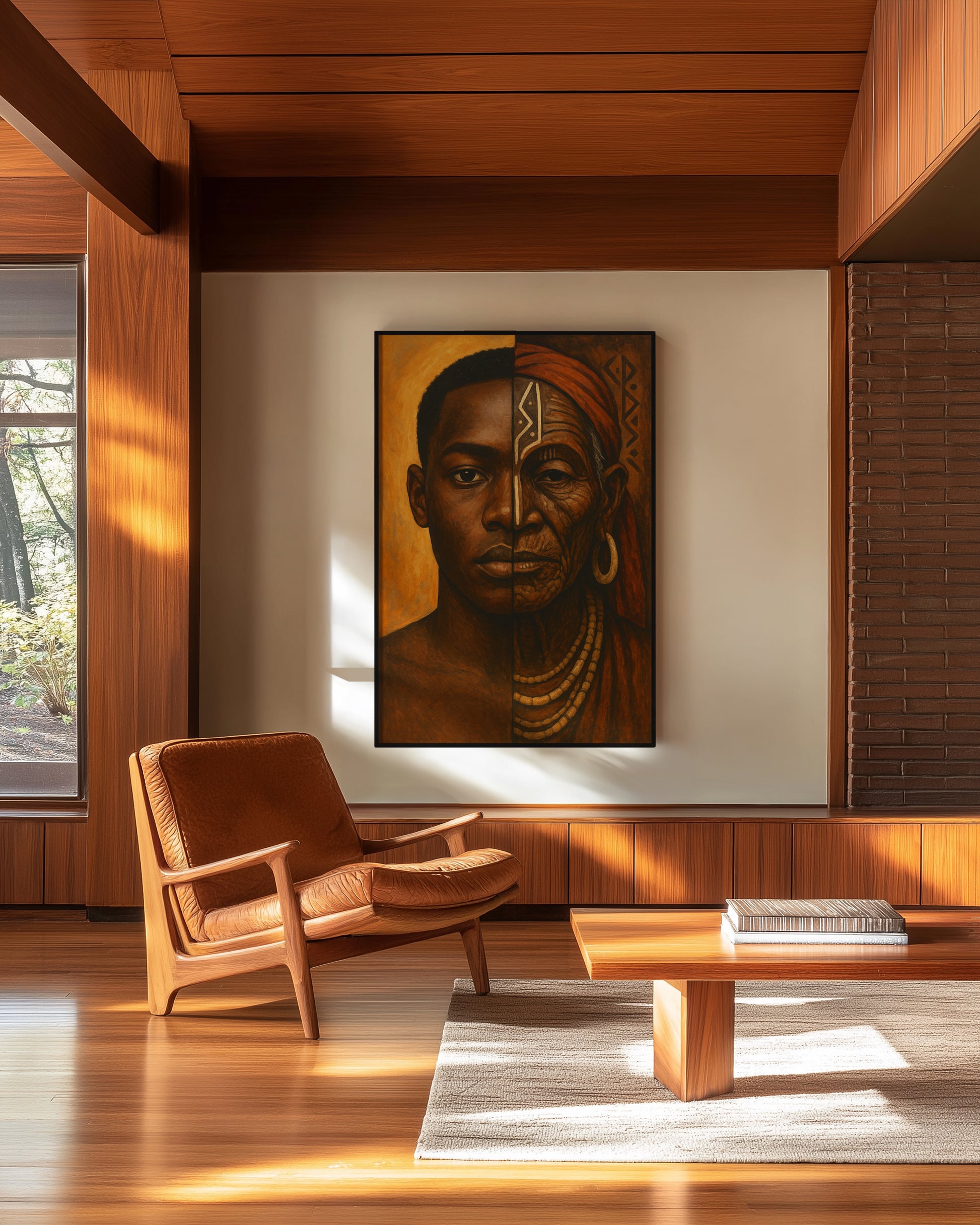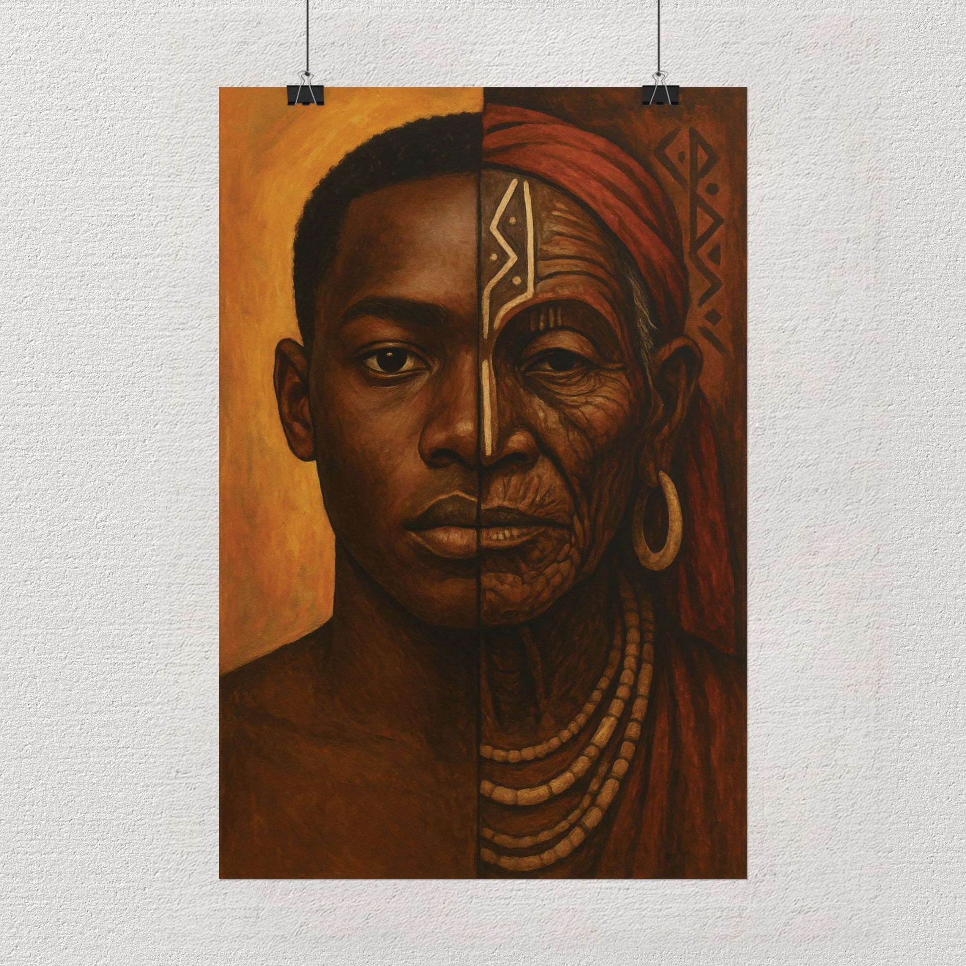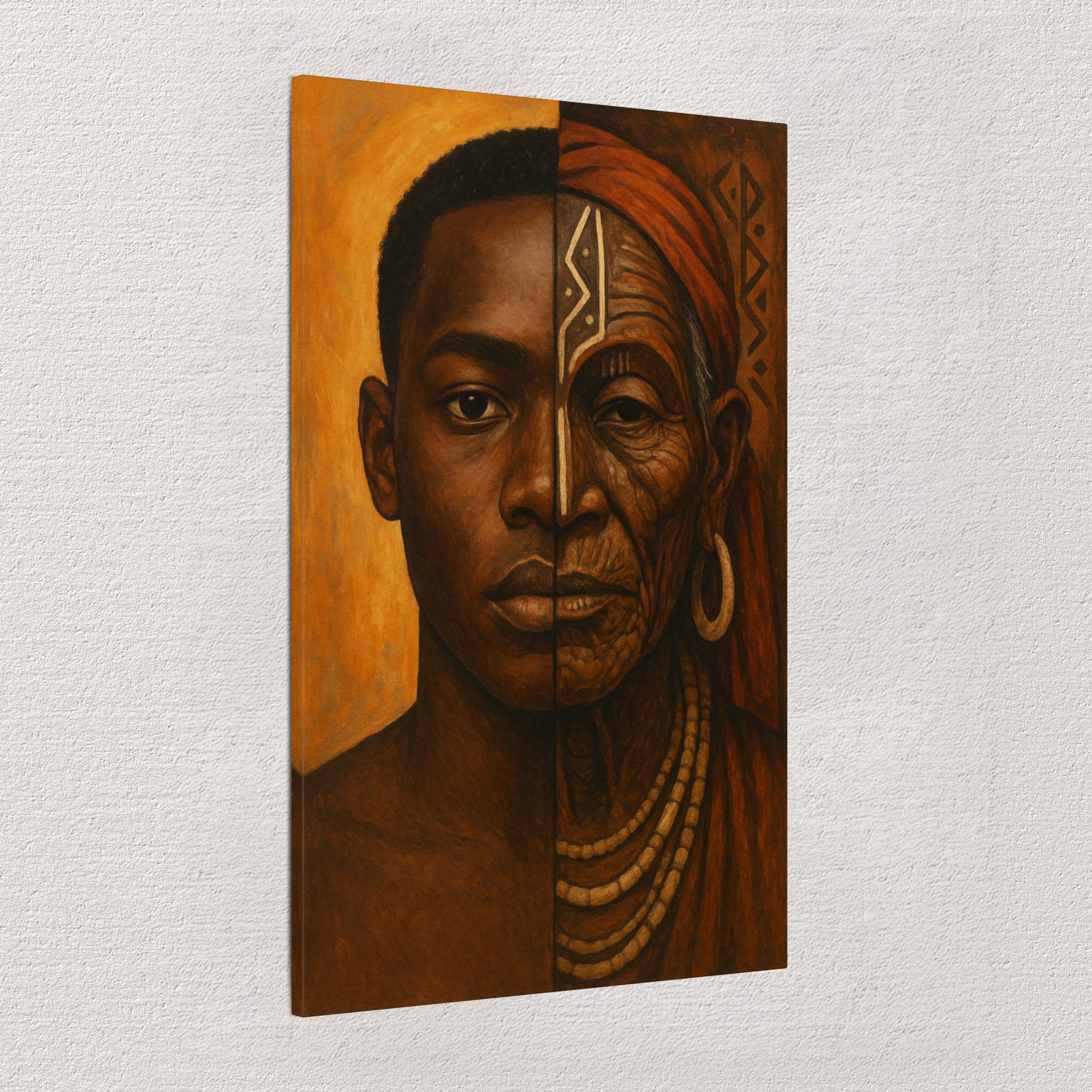 🎨 Unique Design: A symbolic portrait merging a modern African youth and an elder with tribal markings. Each half of the face represents past and present, painted in rich earth tones with traditional patterns integrated subtly.