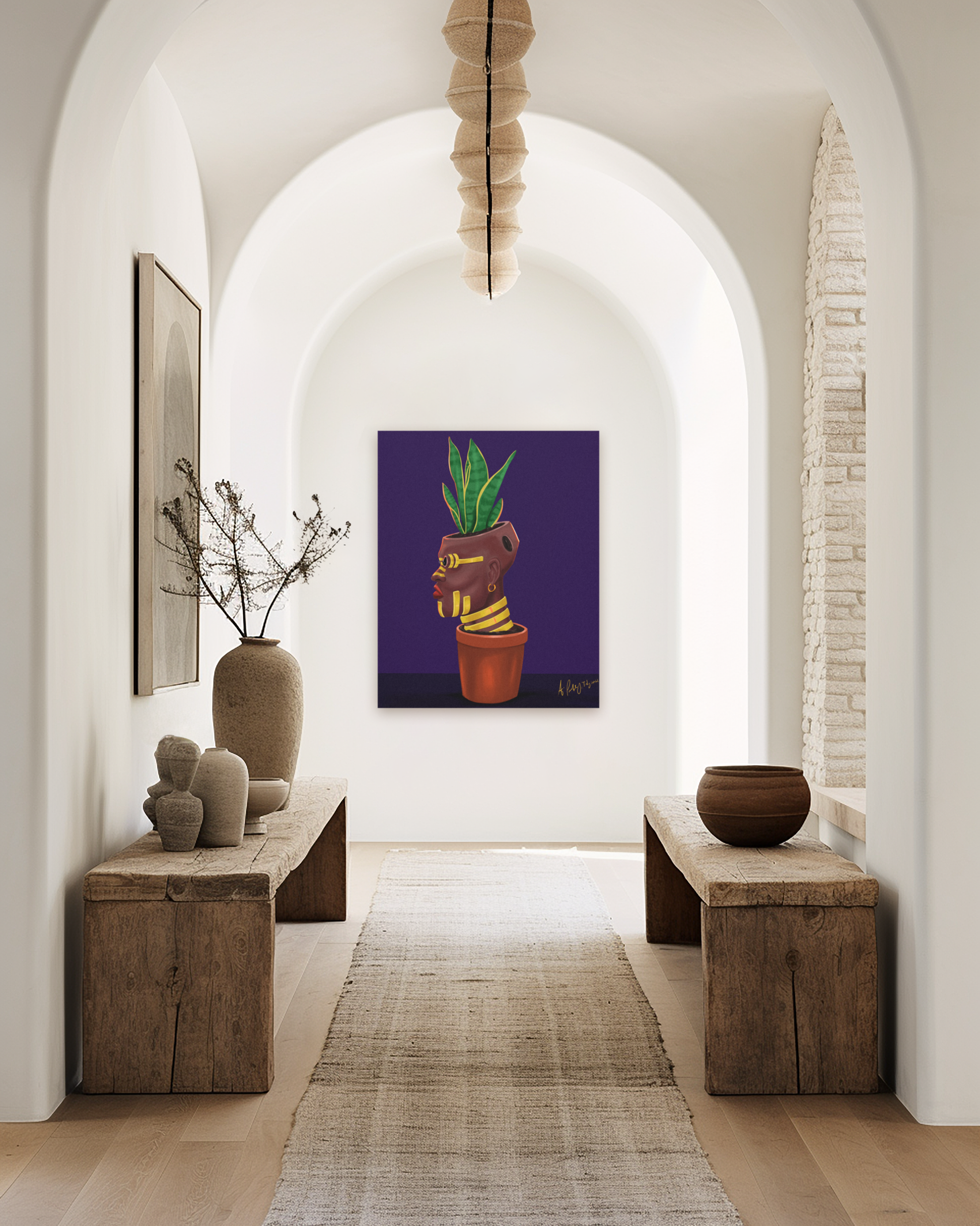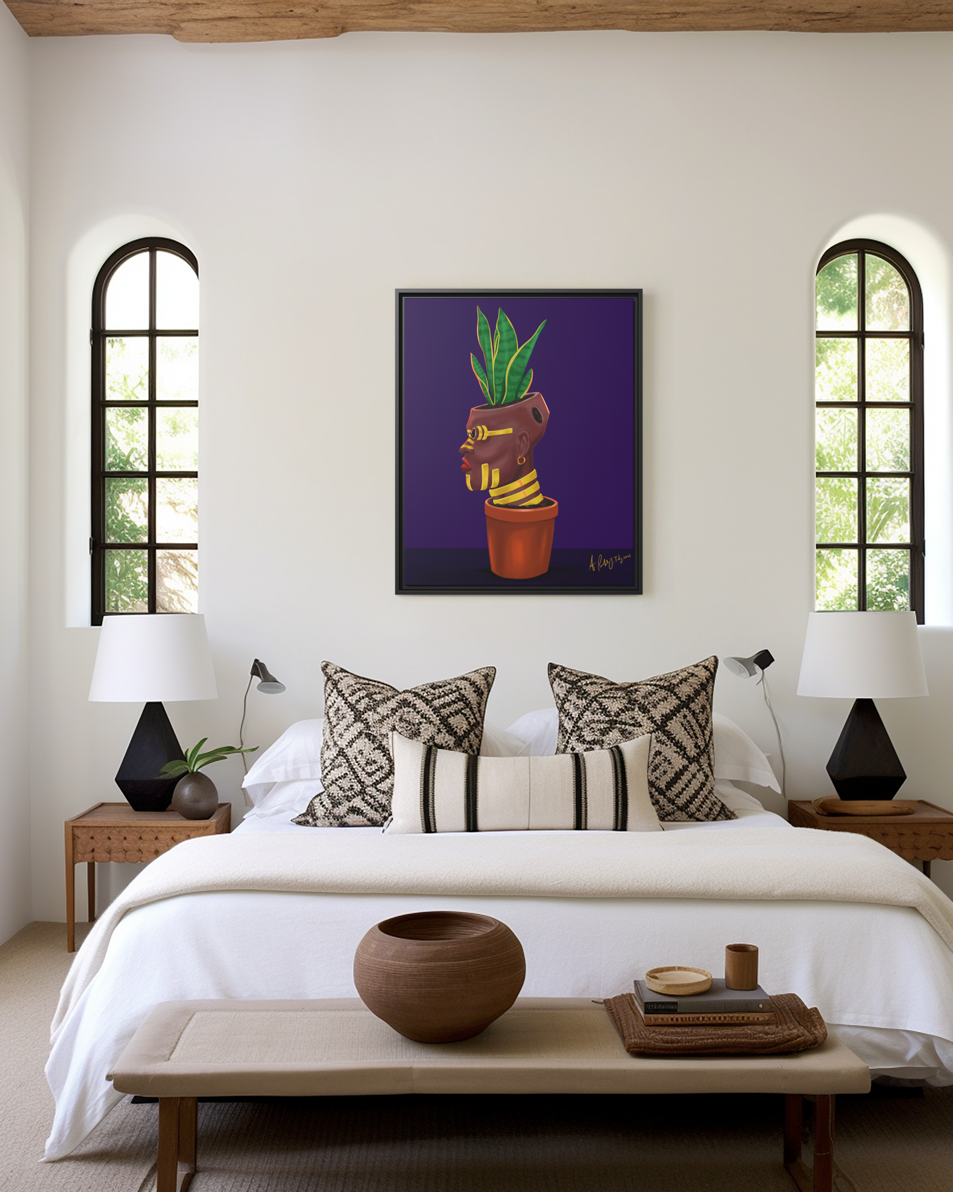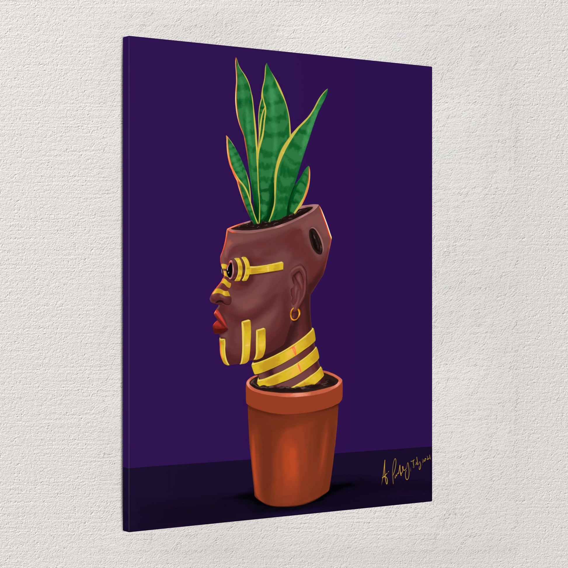 🎨 Unique Design: Flower head 5 is part of a series of paintings I call flower heads. This painting depicts the beauty in the black African appearance and aesthetics in comparison to the greenery and nature of snake plants. When growing they are able to survive without water for a long time despite the speed at which they multiply.