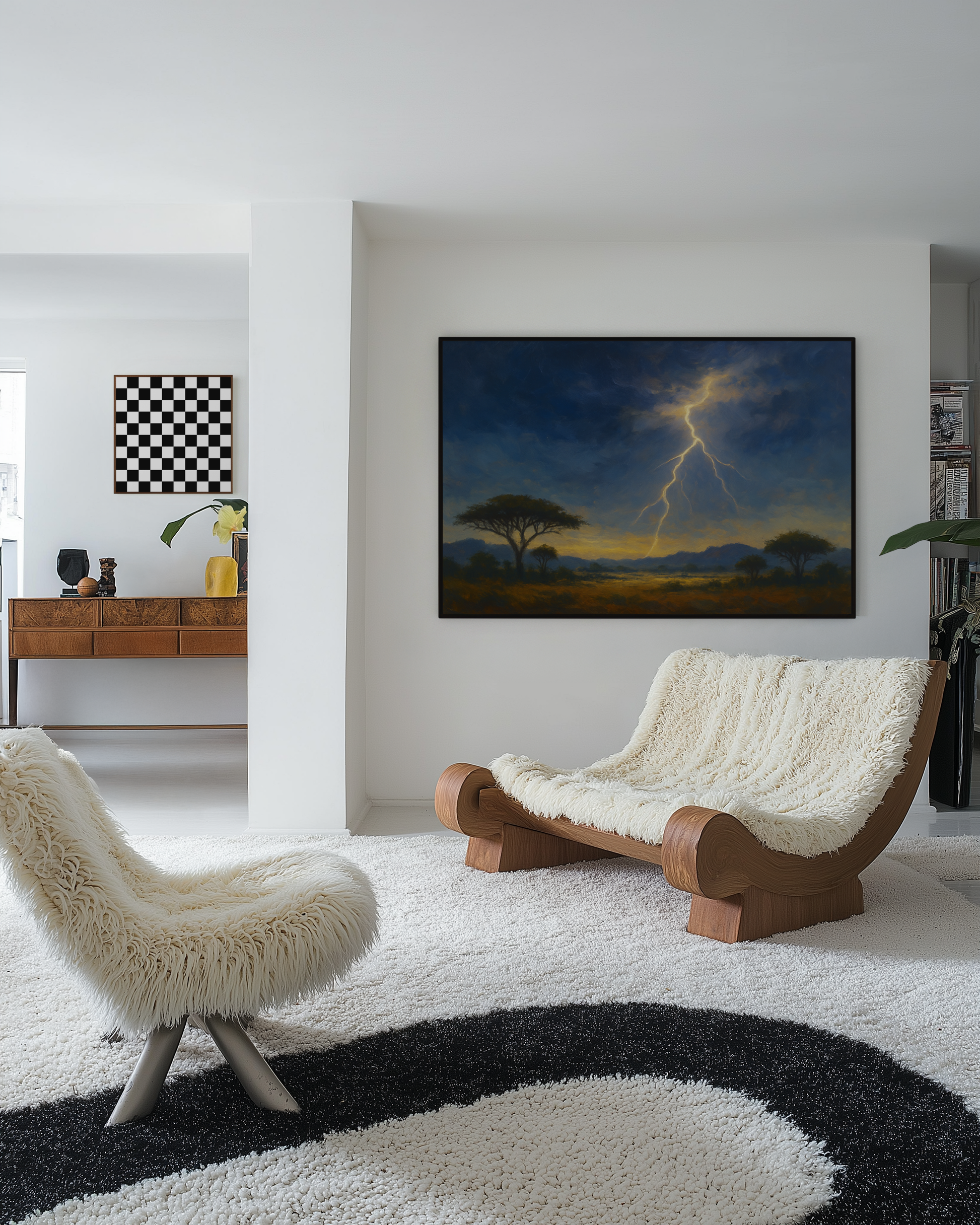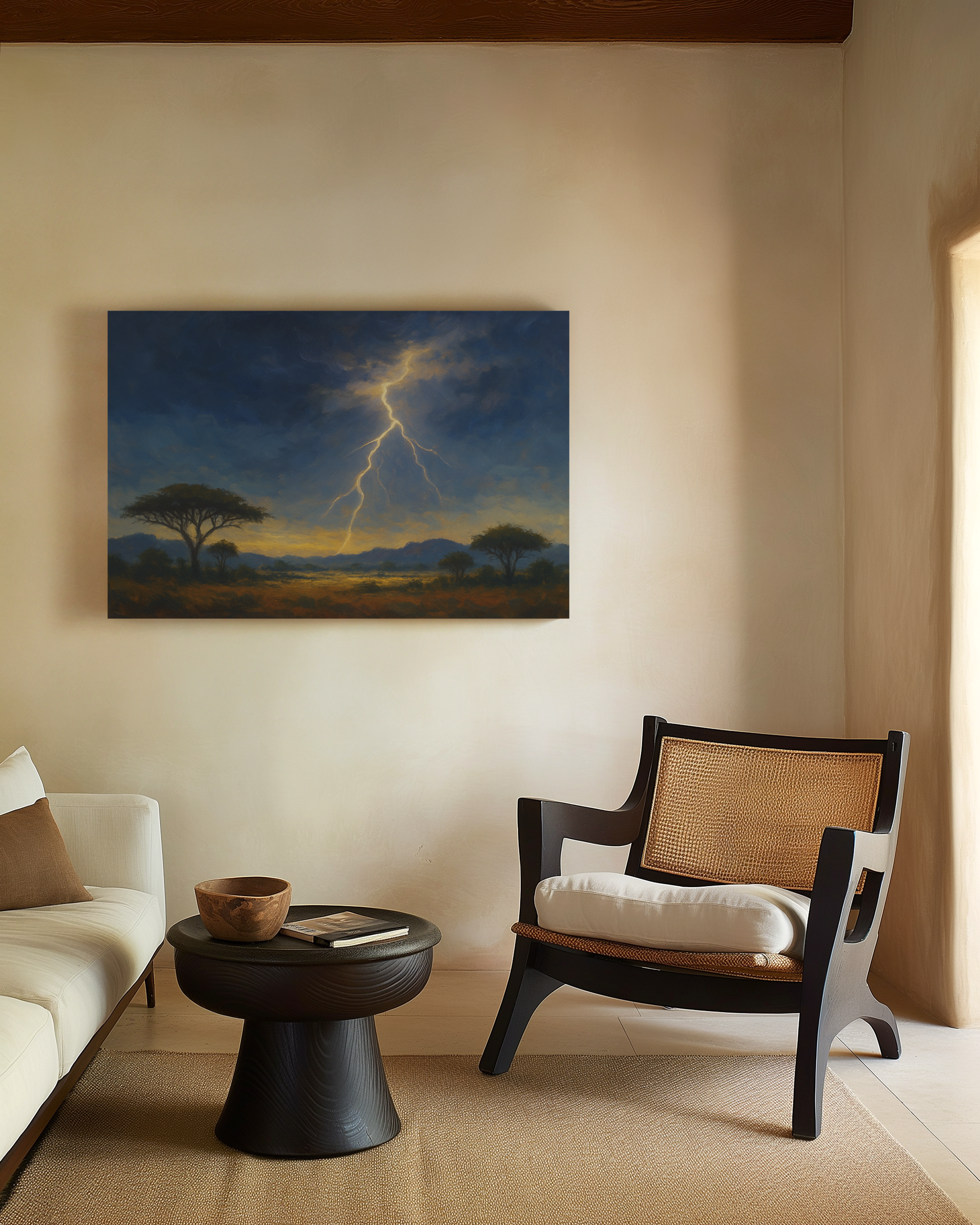 🎨 Unique Design: This artwork aims to transform the often-feared spectacle of lightning into a moment of profound natural beauty and grace, fostering admiration for the serene yet powerful essence of the African landscape and its atmospheric phenomena.